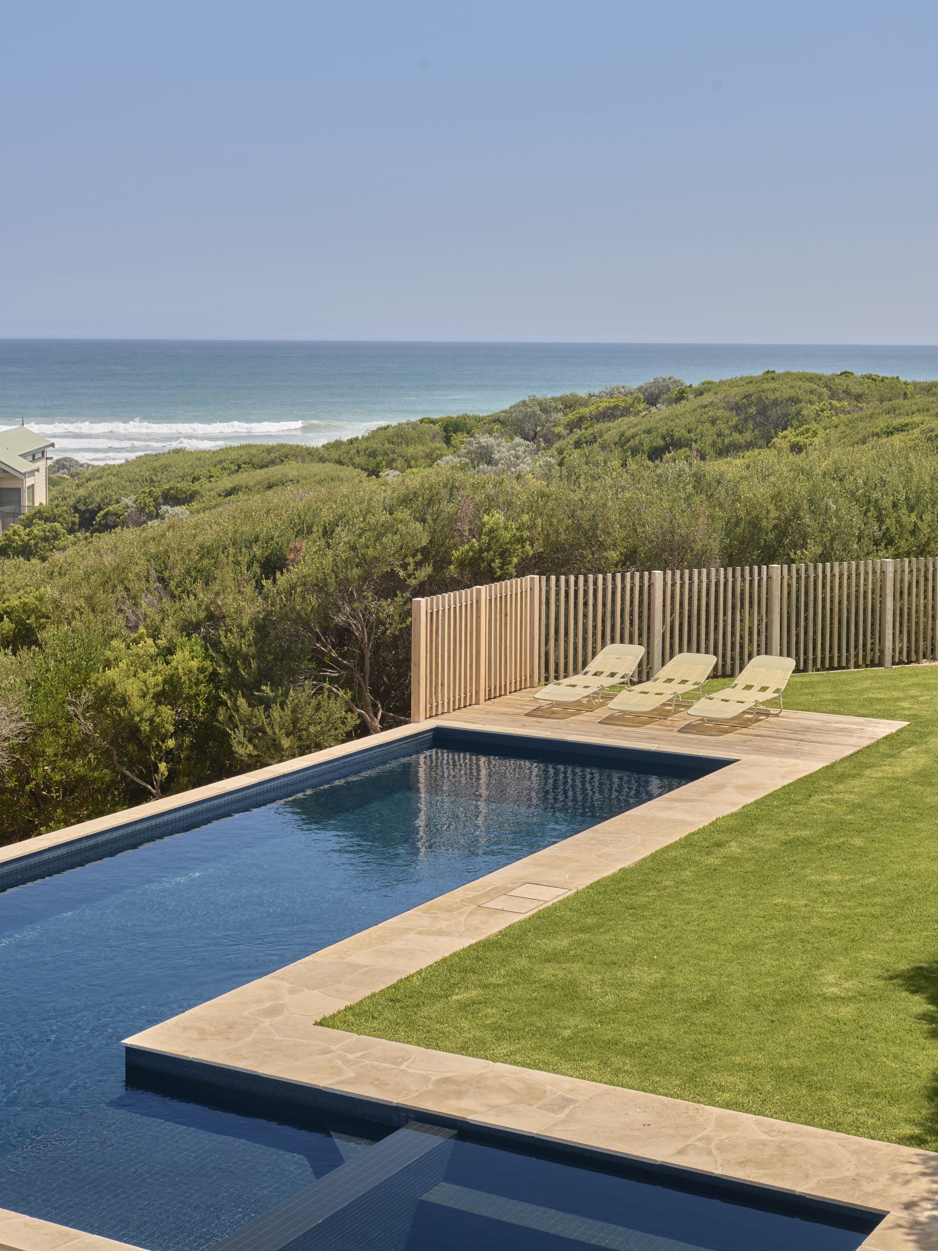 Exterior walls are clad in timber board and battens, juxtaposed with expansive glazing to embrace the ocean views. Natural robust materials such as slate floors, reclaimed bricks and timber work in harmony with the surrounding native coastal landscape.