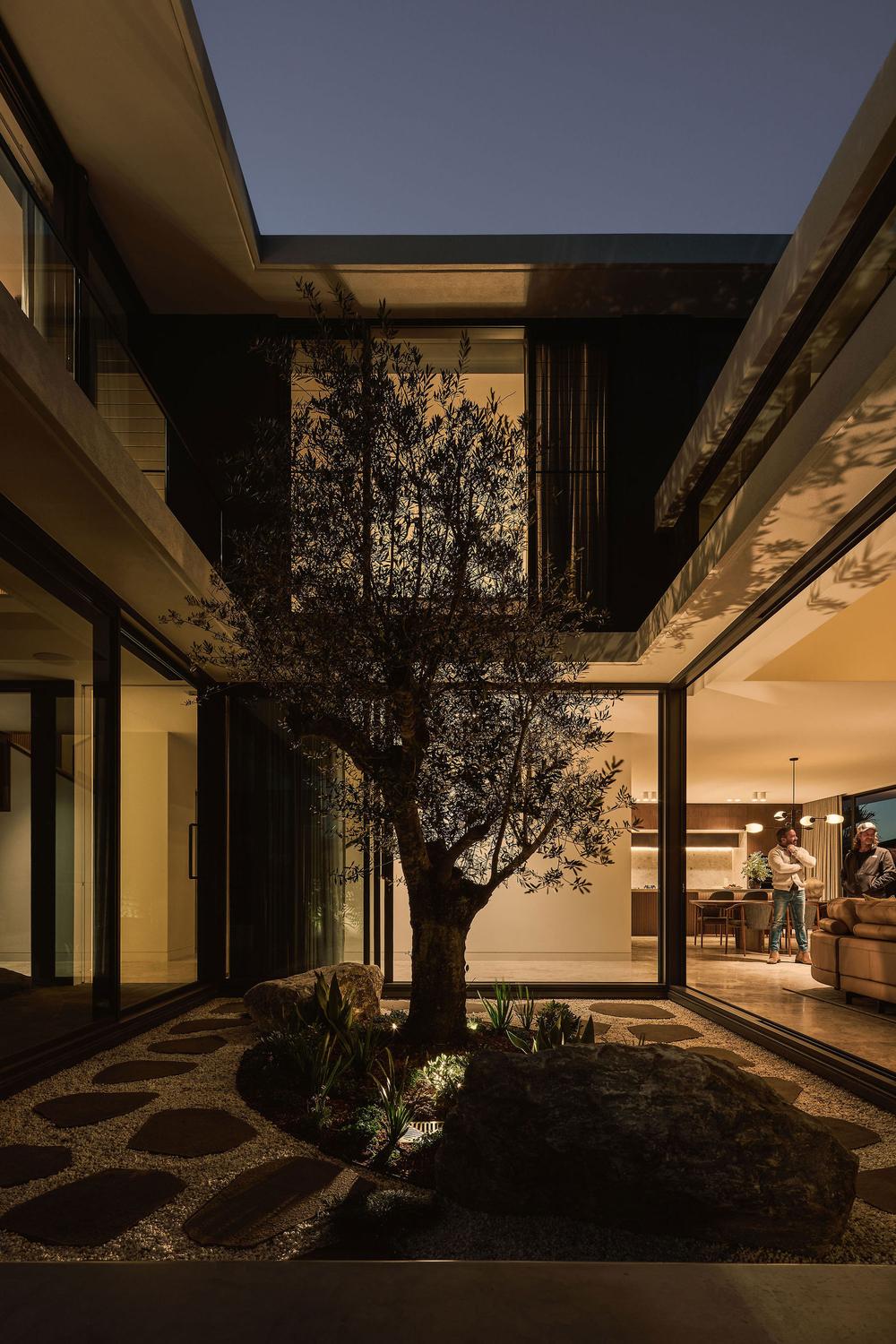 Sorrento House is a refined expression of contemporary sub-tropical living, where bold geometry is tempered by natural materials and landscape. The home presents as a confident architectural composition of cantilevered concrete planes, softened by a tactile material palette of warm timber, textured stone, and patterned breeze blocks. Deep overhangs and finely detailed timber screens provide passive shading and privacy, while maintaining a visual connection to the outdoors.