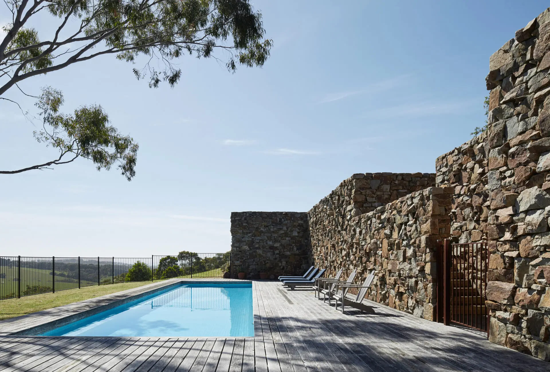 Located in Flinders on the Mornington Peninsula, Whitehall Residence sits on ten acres of rural land, hidden until arrival. Positioned on a slope to capture sea views, it integrates a stone wall that creates two levels: a pool below and terraces above. Composed of rectilinear pavilions, the design separates living areas for different family groups. The master suite connects to the main living room via a glazed walkway overlooking the pool, while a lower level houses wellness facilities. Unlike urban homes, this rural residence emphasizes landscape integration and adapts to the unique rhythms of country living.