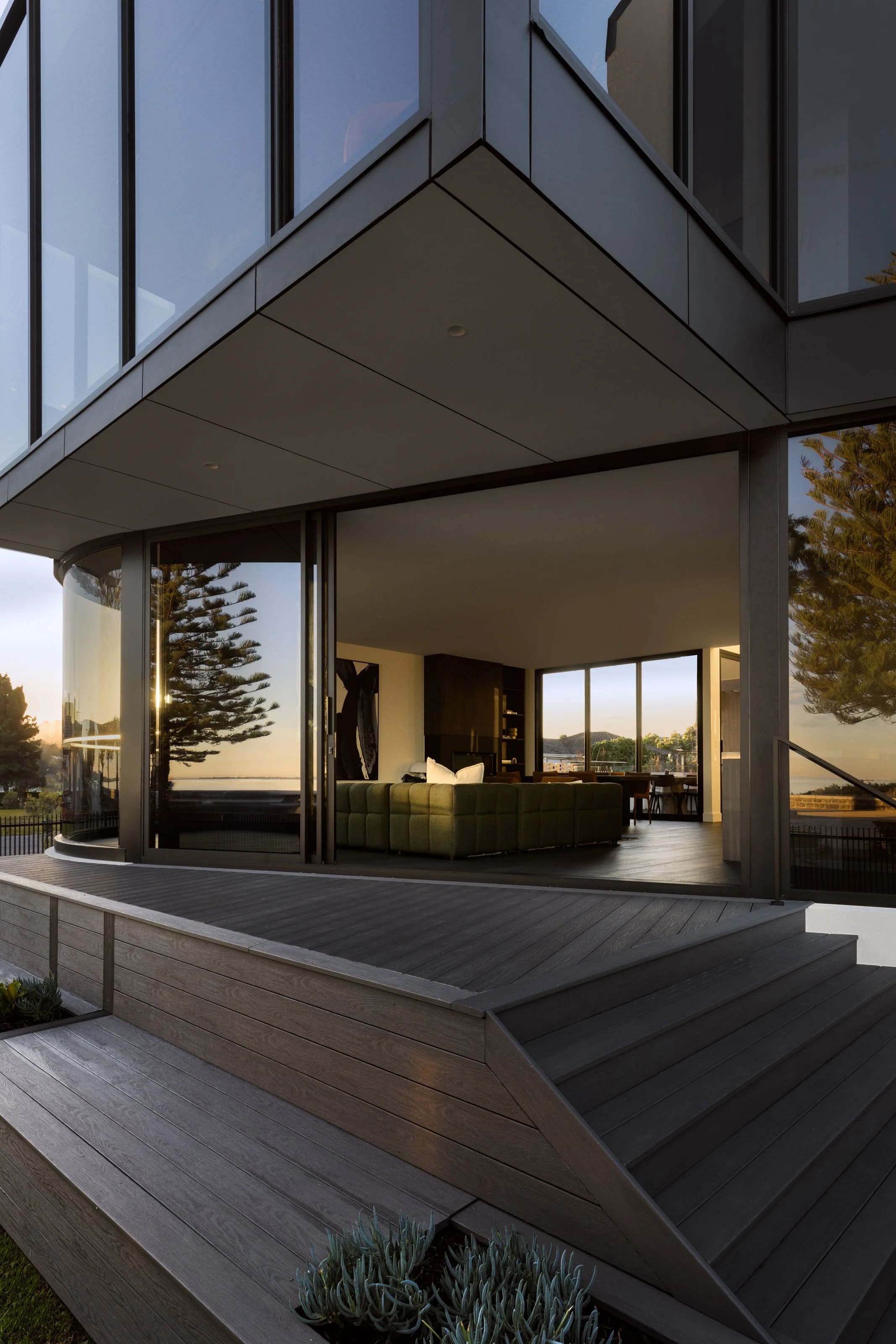 Located on a prime beachfront corner in Altona, this project comprises two luxury townhouses designed to capture sweeping views of Port Phillip Bay. The front residence elevates living areas toward the ocean, with circulation spaces leading to bedrooms and a retreat above, crowned by a master suite with panoramic views. Interiors feature dark timber floors, warm stone, and black accents for a refined modern aesthetic, while bathrooms showcase marble, porcelain, and skylights. Externally, clean lines combine with metal, concrete, timber, and perforated white brick, softened by curved glass windows that frame the ocean outlook.